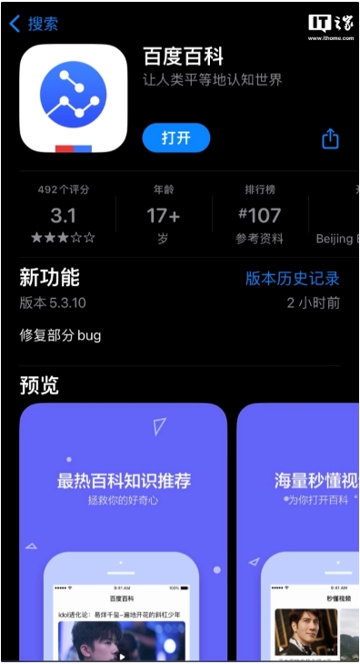 根據蘋(píng)果 App Store 上的數據顯示,百度百科 App 位列“參考資料”類(lèi) App 第 107 名,有 492 個(gè)評分,目前評分 3.1 分,百度還對百度百科 App 進(jìn)行了更新。