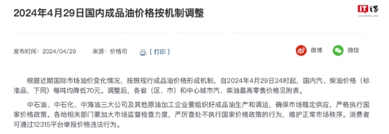 根據近期國際市場(chǎng)油價(jià)變化情況,按照現行成品油價(jià)格形成機制,自 2024 年 4 月 29 日 24 時(shí)起,國內汽、柴油價(jià)格每噸均降低 70 元。