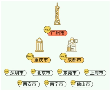 全國消費熱度 TOP10 城市依次為廣州、重慶、成都、深圳、北京、東莞、上海、西安、南寧、佛山。