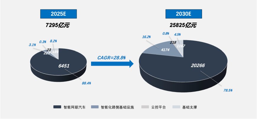 中國汽車(chē)工程學(xué)會(huì )研究顯示,預計2025年、2030年車(chē)路云一體化智能網(wǎng)聯(lián)汽車(chē)產(chǎn)業(yè)產(chǎn)值增量為7295億元、25825億元,增長(cháng)勢頭強勁。另?yè)惖锨罢爱a(chǎn)業(yè)研究院報告,2030年中國智能網(wǎng)聯(lián)車(chē)市場(chǎng)規模有望突破5萬(wàn)億元,車(chē)路云一體化相關(guān)市場(chǎng)規模超14萬(wàn)億元。